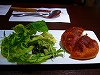 まずはサラダとパンが一皿にのって出てくる。「アンチョビパン」だって。味わいのあるパン。ちょっとハードだけど、かみしめているとおいしい。おかずに合うようなパン。底のほうに、アンチョビの塩味がしみている。ここの1Fで売られているそう。