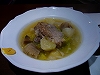 スープの皿が出てくる。キャベツ、ごぼう、じゃがいも、カブ、セロリとお野菜ふんだん、鶏肉はほろほろと崩れる。お皿にマスタードが少し添えられて、それを肉につけてもおいしい。